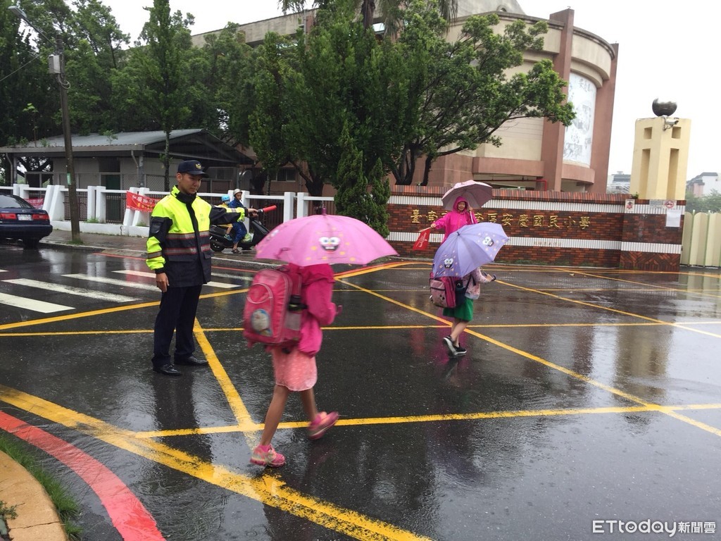 ▲市警三分局15日上午冒雨執行護童勤務,對三分局轄9所學校護童。(圖/記者林悅翻攝,同下)