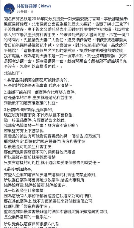 知名律師呂秋遠2015年間接受一名丈夫委託,擔任其控告妻子與小王通姦妨害家庭案件的律師,之後卻又接受這名妻子的委託,主張是小王利用權勢脅迫她性交。這兩起案件雙方不同事實的正反面主張,訴訟有利害衝突實質關聯,呂秋遠因此遭律師懲戒委員會記申誡。對此律師林智群在臉書上提出看法。