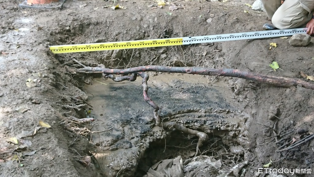 ▲試挖後發現老樹棲地底下有瀝青混凝土層。(圖/台中市建設局提供)
