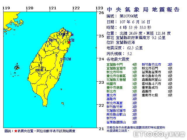 中央氣象局地震報告出爐!宜蘭縣近海16日清晨4點53分發生有感地震規模5.2,深度62.3公里,位置在宜蘭縣政府東偏南方9.2公里。