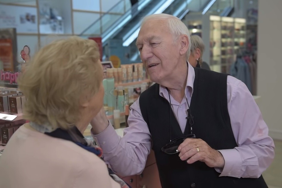 愛爾蘭的83歲奶奶莫娜(Mona Monahan)因為生病,視力逐漸惡化,未來某一天可能會完全失明,她的丈夫德斯(Des Monahan)希望妻子就算看不見了,也能感覺自己仍然是美麗的,因此親自到專櫃學妝。現在他已經可以自己獨自幫妻子畫完全妝,深情的行為感動許多網友。