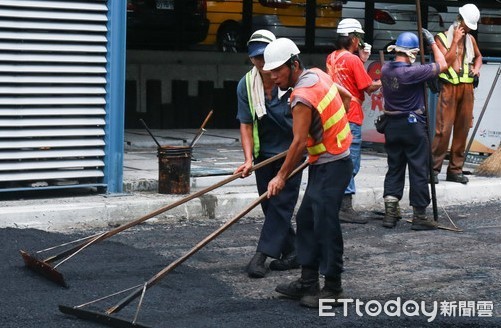 ▲北市路平專案中工人鋪設柏油路。(圖/記者周宸亘攝)