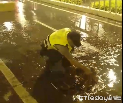 ▲一位員警在雨中,用手清理小東地下道機車道上排水孔的落葉,確保排水順暢。(圖/記者林悅翻攝)