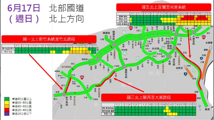 今年端午連假首日,國道路段大致順暢,但西部國道受到幾起交通事故影響,國1南下湖口服務區至新竹、國3南下和美至彰化系統,及北上木柵休息站至南深路等路段車多壅塞。