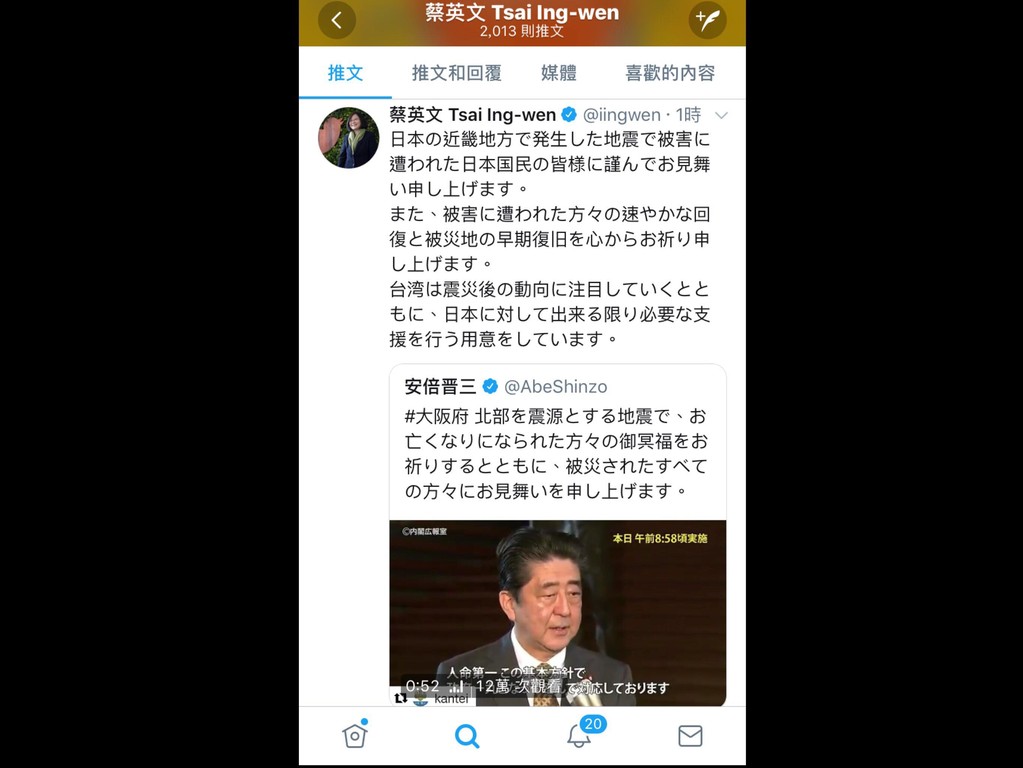 ▲日本大阪強震,蔡英文推特發文。(圖/翻攝推特)