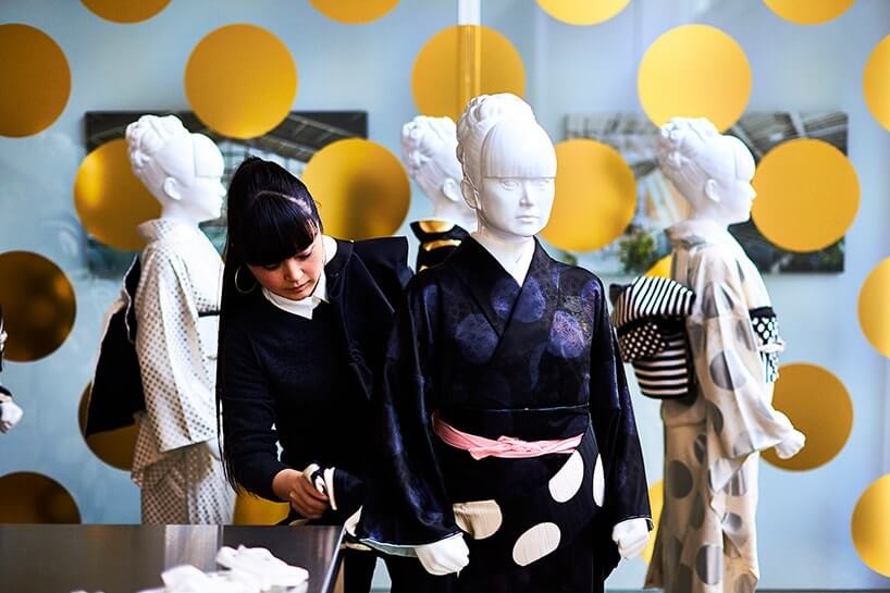 喜歡運用圓形與直線創造各種造型的藝術家高橋理子(Takahashi Hiroko),她在東京的工作室牆面佈滿許多黃色圓點,營造活潑有趣的氛圍。巴貝拉也拍下高橋理子正在細心調整模特兒的衣服,留下藝術家專注創作的身影。
