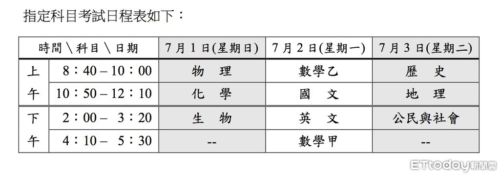 指定科目考試的考科,7月1日考試依序為物理、化學、生物,7月2日依序為數學乙、國文、英文、數學甲,7月3日則是歷史、地理和公民與社會。三天考試第一堂皆從8點40分實施。