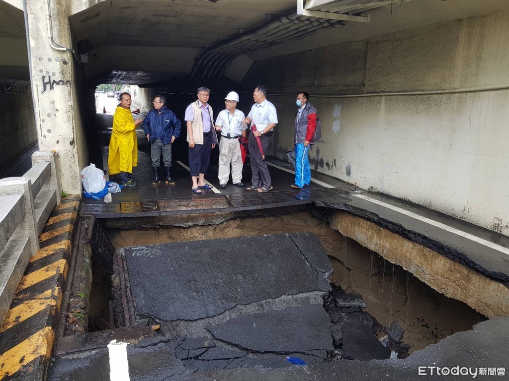 ▲台南市連夜豪大雨,東區林森路地下道機車道19日清晨突然塌陷,3輛機車閃避不及當場摔入凹洞受傷送醫,台南市長李孟諺等人接獲消息立刻親往現場勘察。(圖/市府提供)