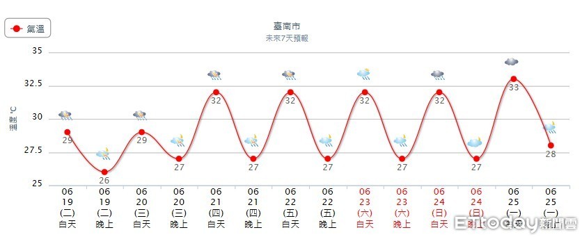 週四至週五(6月21日、22日)仍受西南風影響,台南天氣仍不穩定,降雨的時間會變短一些,但仍要注意短時強降雨。6月23日週六起,太平洋高壓勢力逐漸增強,天氣才會趨向穩定,但由於南方雲系北移,還是有些南邊水氣會影響到台南,會有局部短暫的陣雨現象,範圍和雨量都會比過去幾天明顯減小,因為天氣逐漸穩定,雲量減少,氣溫也會明顯回升。