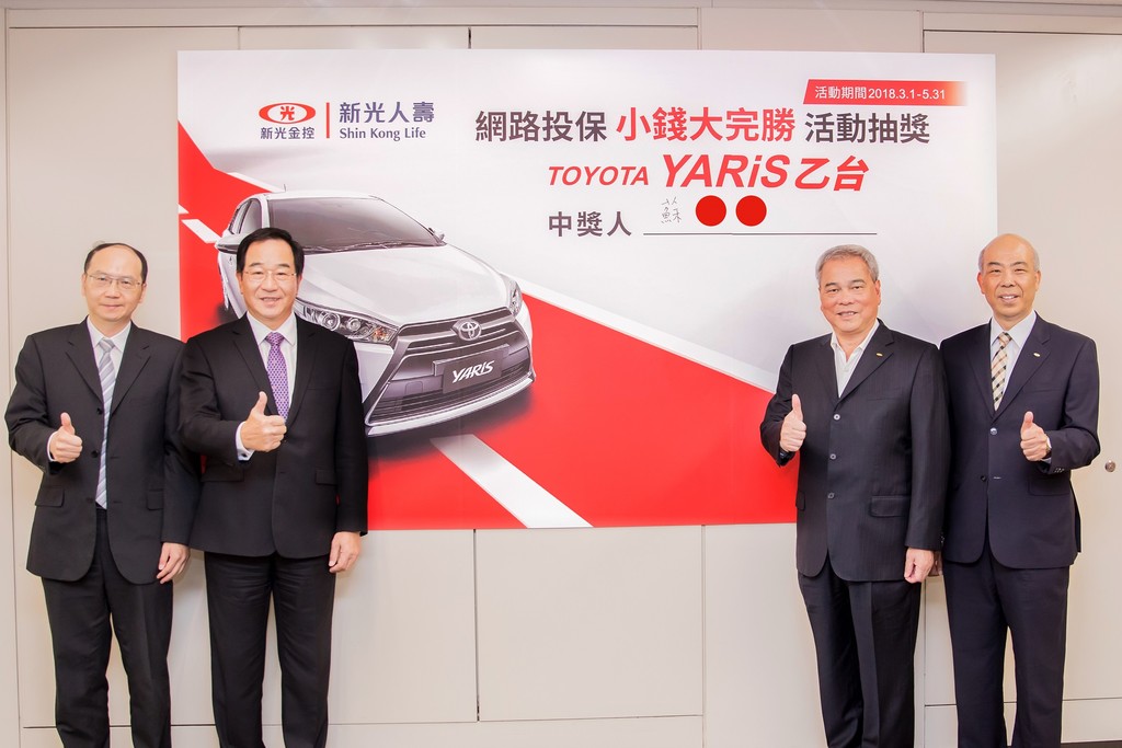 ▲新光人壽網路投保《小錢大完勝》活動,抽出YARIS汽車蘇姓得主。(右起為新光人壽部資深協理黃明正、總經理蔡雄繼、副總經理鍾俊豪與律師林材勇) 。(圖/新光人壽提供)