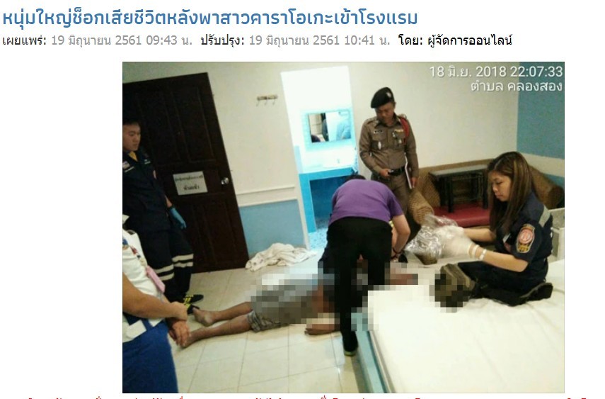 巴吞他尼府(Pathum Thani) 空鑾縣(Khlong Luang)警方表示,41歲男烏迪蓬(Wuthipong)18日和3名友人一同到卡拉ok喝酒,但之後卻突然消失長達1小時,友人後來接到在卡拉OK工作的女子電話,得知烏迪蓬和她開房後,突然倒在飯店房間內不醒。