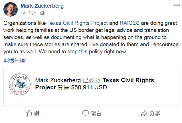 根據《每日郵報》報導,祖克柏夫婦分別向德克薩斯聖安東尼奧法律援助組織(RAICES Texas),以及德克薩斯民權項目(Texas Civil Rights Project)捐款,這2個機構主要在幫助移民獲得合法身份,並提供他們相關法律與翻譯服務。祖克柏透過發言人表示,「這項政策現在需要結束了,我們捐款希望幫助他們,也鼓勵大家一起做。」