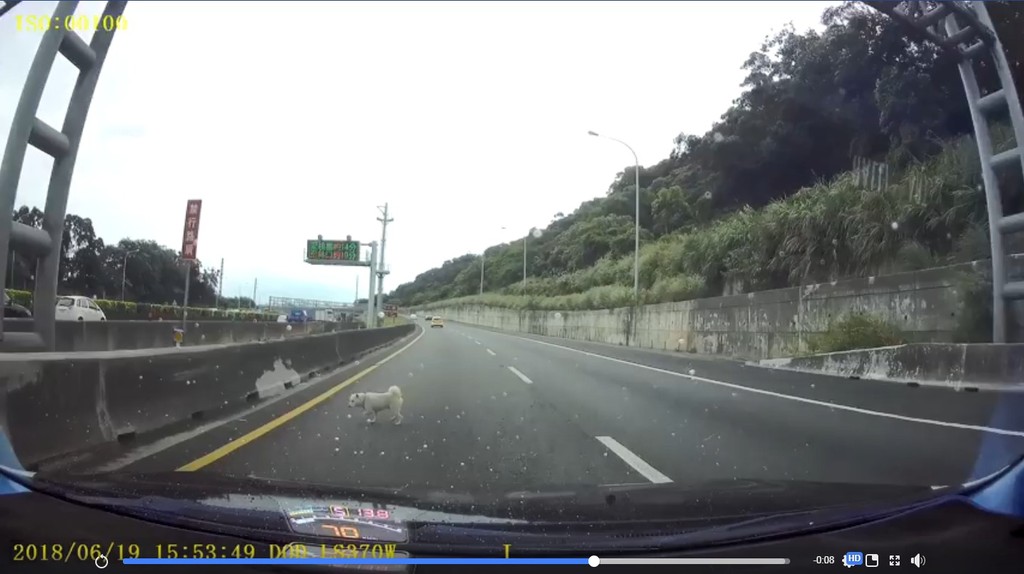 網友行經國道一北上五楊高架轉接道入口時,突然在前方看見一條狗緩步經過,於是從90幾公里的時速減慢不到30公里,為了就是讓狗可以經過。但沒想到後方貨車疑似沒保持安全距離,直接從後方追撞上去,並隨即逃逸。