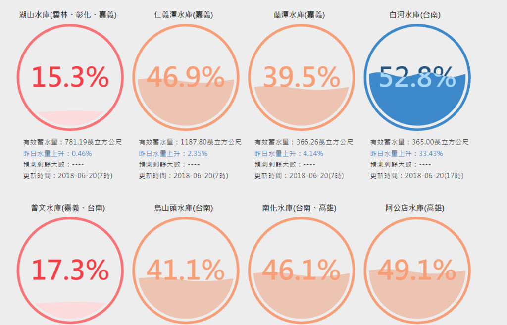 直到19日南台灣豪雨才讓白河水庫水量出現進帳,根據「台灣水庫即時水情」資料顯示,白河水庫在19日一天就進帳33.43%的水量,總蓄水量過半達到53.1%,讓原本二期稻作的灌溉吃緊的情勢獲得緩解。