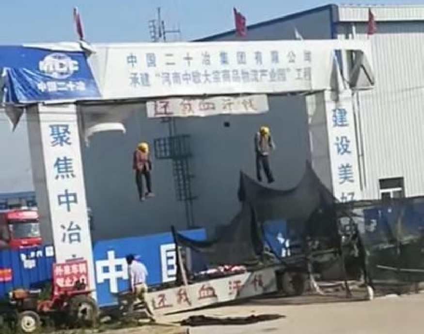 從側拍影片畫面中可見,工地們口上寫著「中國二十冶集團有限公司承建『河南中歐大宗商品物流產業園項目』工程」,而匾額下方卻有2個血跡抗議布條,上面都寫著「還我血汗錢」;正中間處則是懸掛著2個「屍體」,且帶著工程帽等工人打扮,雙手雙腳無力垂下,畫面超級嚇人。