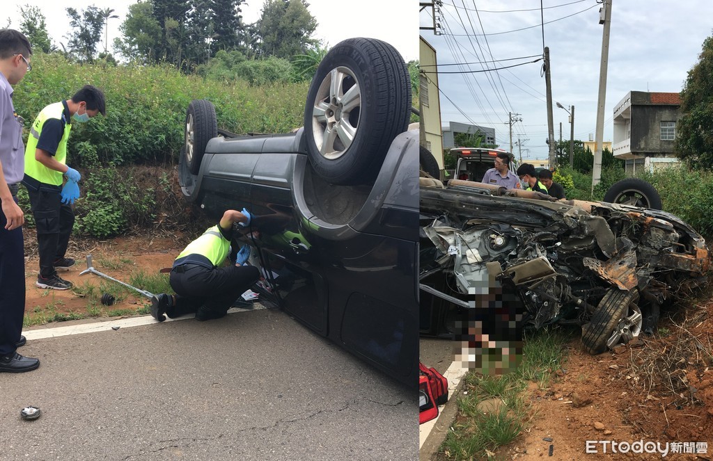 ▲疑撞電桿翻車受困,男駕駛命危。(圖/記者林妍君翻攝)