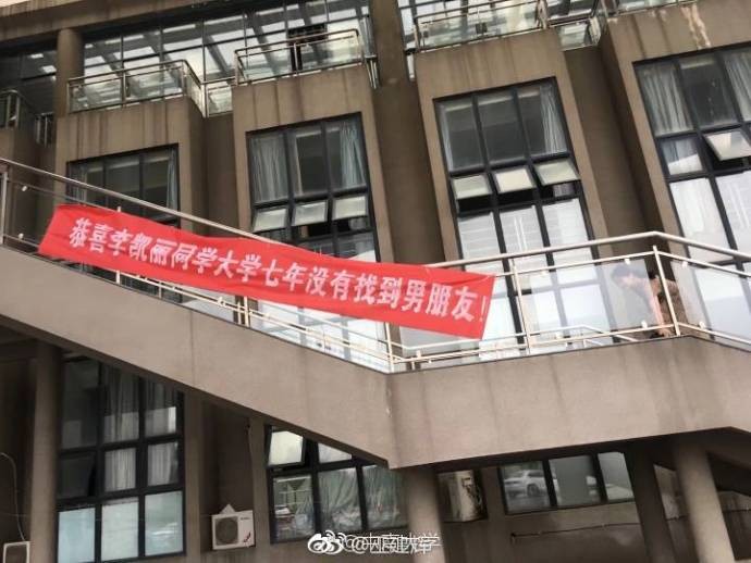 湖南長沙的中南大學6月20日舉行畢業典禮,就讀建築與藝術學院的女孩李凱麗即將從研究所畢業,而室友付姓同學送給她一份特別的畢業禮物,就是拉布條慶祝她在大學加研究所單身7年。付同學說,「我看到有很多人拉橫幅,答辯成功、順利畢業這些…我就覺得這個(單身)可以慶祝一下。」李凱麗一看到布條,就知道是室友搞的鬼,大喊「妳給我出來」。