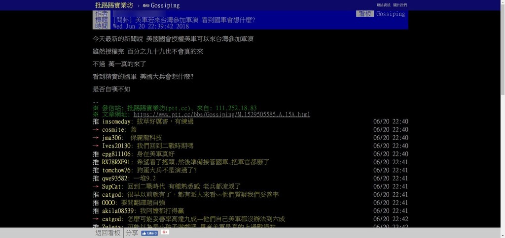 批踢踢鄉民在八卦版發文指出,美國國會授權美軍可以來台參加軍演,雖然可能99%不會真的來,但如果萬一真的來,「看到精實的國軍,美國大兵會想什麼?是否自嘆不如?」