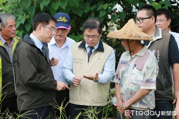 ▲台南市長李孟諺,在農業局許漢卿局長陪同下,前往六甲區關心水稻收成情形。(圖/市府提供)