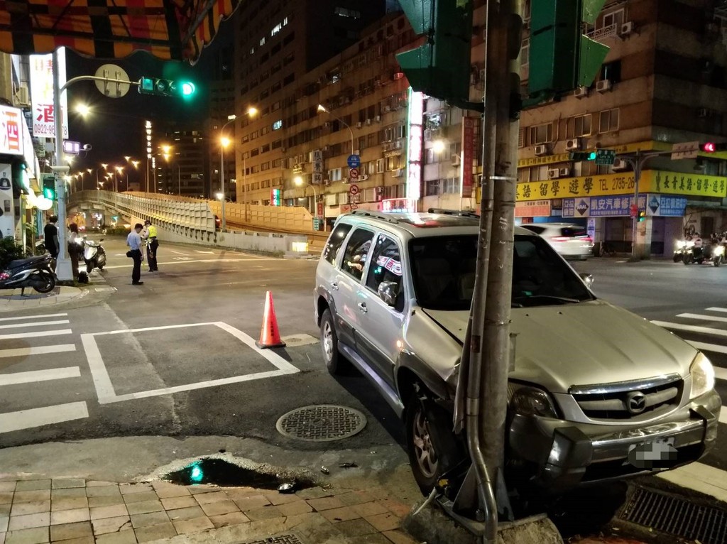 台北市大安區基隆路樂業街口,22日晚間9時許一名駕駛銀色休旅車的劉姓男子(35歲),突然駕車衝撞路邊號誌燈桿,途中還擦撞了4部機車及1輛轎車,造成5人受傷。