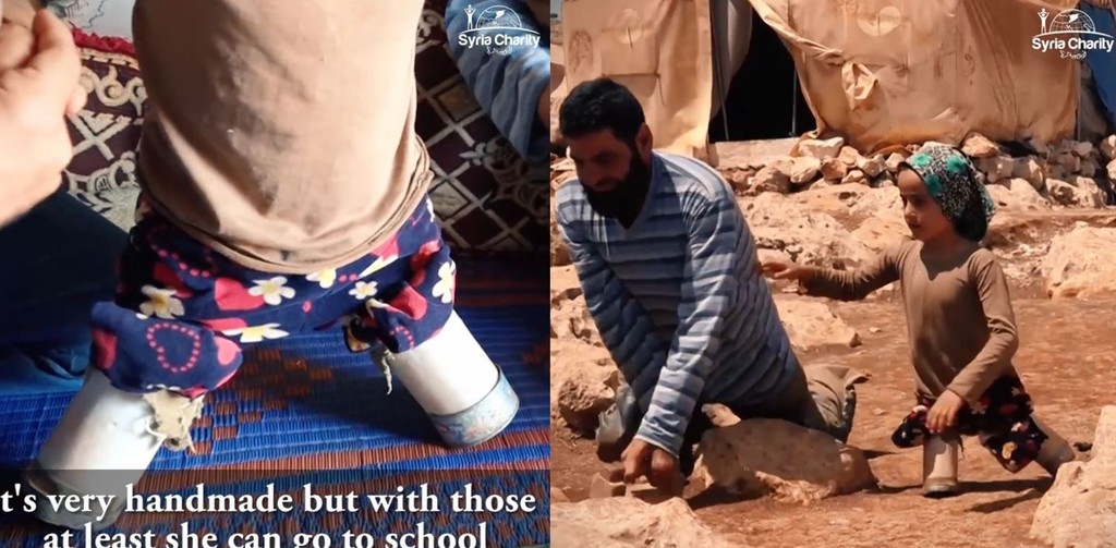 綜合外媒報導,瑪雅平時都在伊德利卜(Idlib)的難民營活動,面對鏡頭,她沒有流淚,反而是相當淡然,還會背著書包去上學。穆罕默德告訴敘利亞慈善機構,每次他看見女兒在朋友前面爬行時,他總是感到心痛,因此他自製簡陋的「義肢」,利用清洗過後2個罐頭,再加上塑膠、棉花與布料,就成了孩子暫時的輔助工具。
