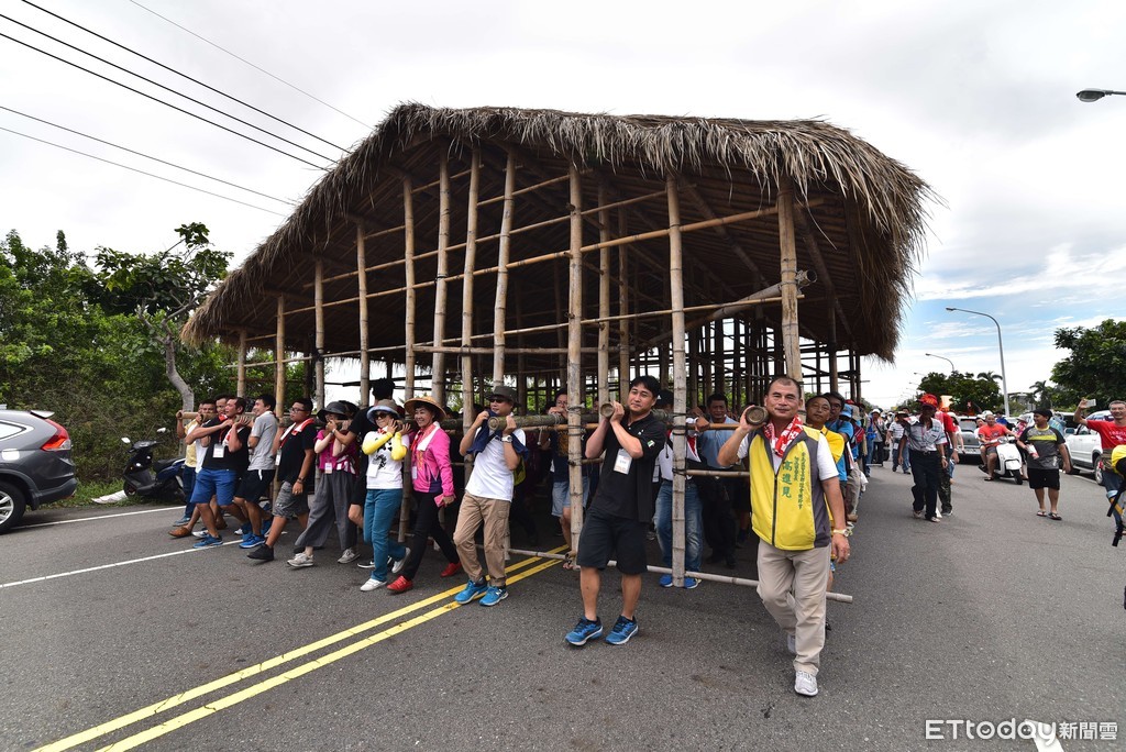 ▲超過數百位庄民與地方耆老,合力扛起李養匠師重建的竹籠茨重回原庄頭,藉以呈現日本時期曾文溪水患不斷,村人相互幫伴扶持共度水患難關的生活場景。(圖/台史博提供)