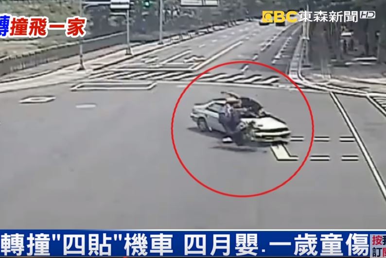 ▲違規左轉撞碎「四貼」機車,1歲童顱內出血、4月嬰耳朵撕裂傷。(圖/翻攝自東森新聞)