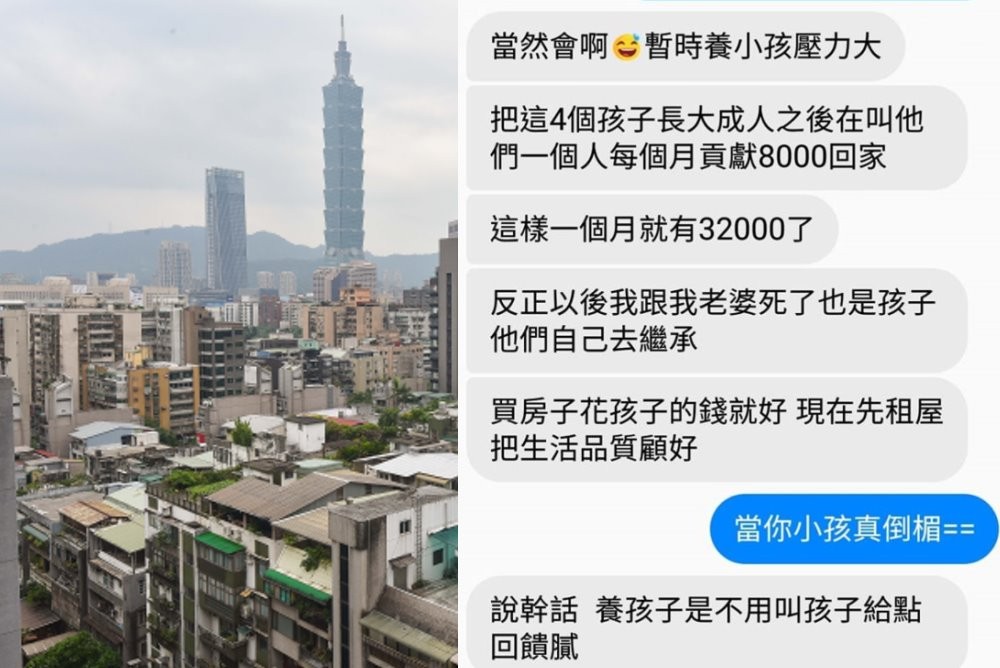 這名朋友在「爆廢公社」臉書社團分享和這位爸爸的對話,他問「你都不打算買房子喔」;對方回,「當然會啊,暫時養小孩壓力大。把這4個孩子長大成人之後,再叫他們一個人每個月貢獻8000回家,這樣一個月就有3萬2000。」