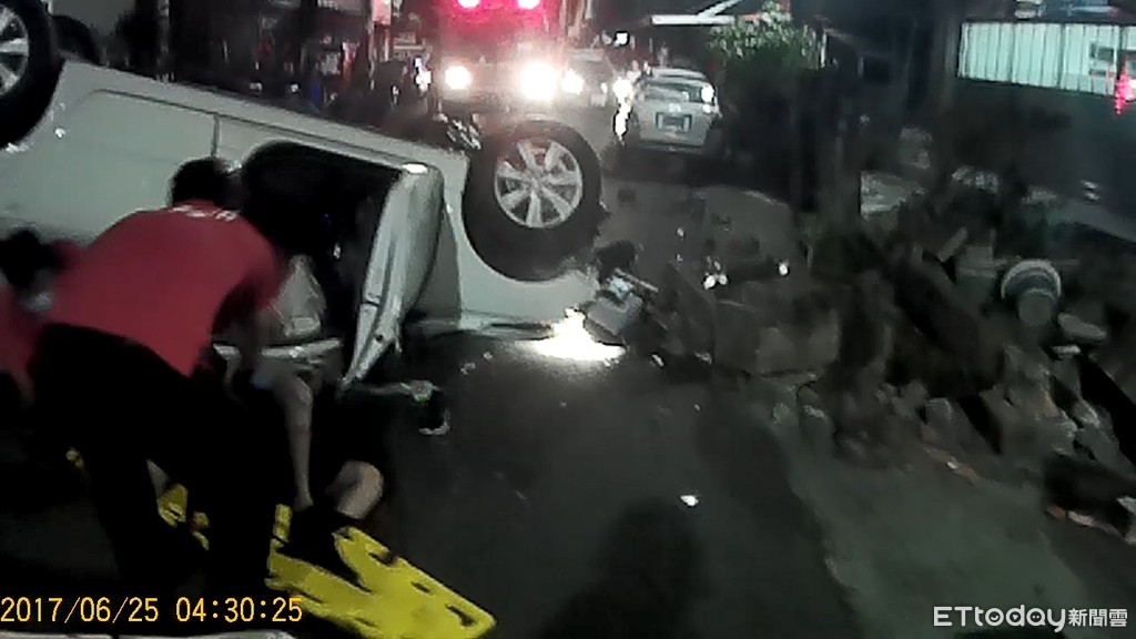 嘉義市永安街與崇文街口25日凌晨4時15分發生車禍,警笛聲劃破寂靜的夜,消防局救援車輛迅速急馳抵達事故現場,發現一輛白色自小客車衝撞路邊民宅圍牆翻覆於路中央,圍牆磚塊及盆栽倒落一地,現場一片狼藉,十分嚇人。