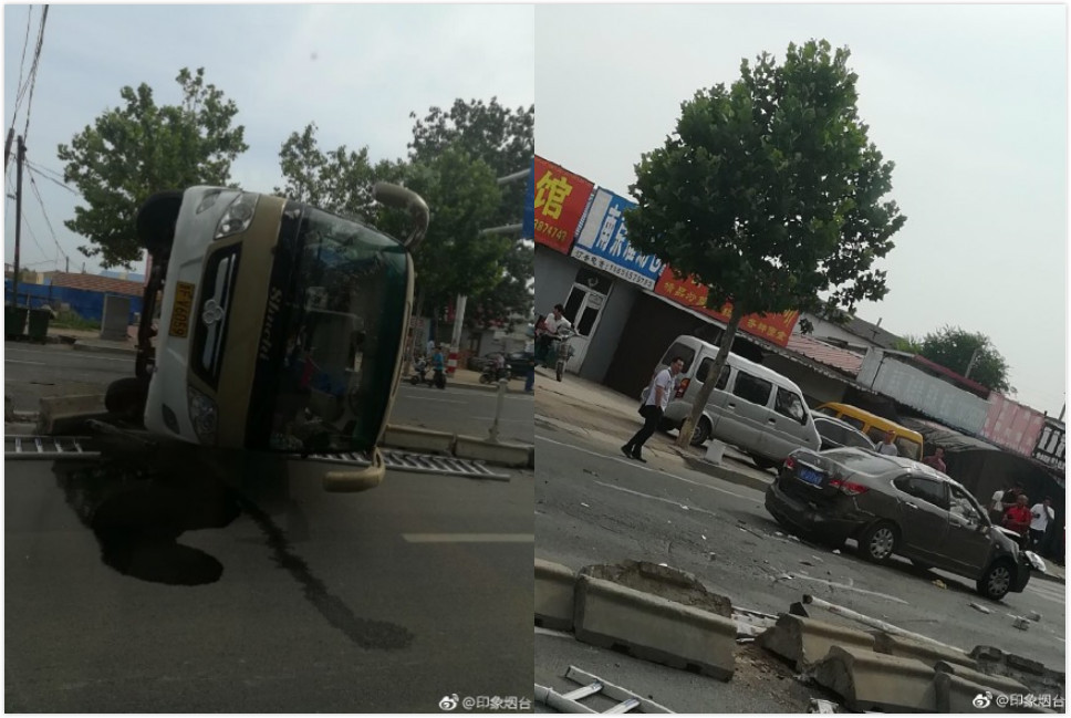 ▼多輛汽車被撞翻,分隔島也受損。(圖/翻攝印象煙台微博,下同。)