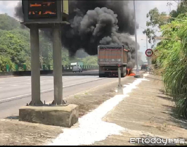 桃園市消防局表示,這起國道3號火燒車發生在今日上午11時14分許,一部聯結車行經國道3號北上74.2公里處,駕駛發現車頭冒出濃煙,緊急將車輛停至路肩,並向警方報案請求救,轄區分隊第四大隊高平分隊據報,並同時請求鄰近新竹縣消防局就近支援,共10名消防人員,消防車及救護車5輛前往灌救。