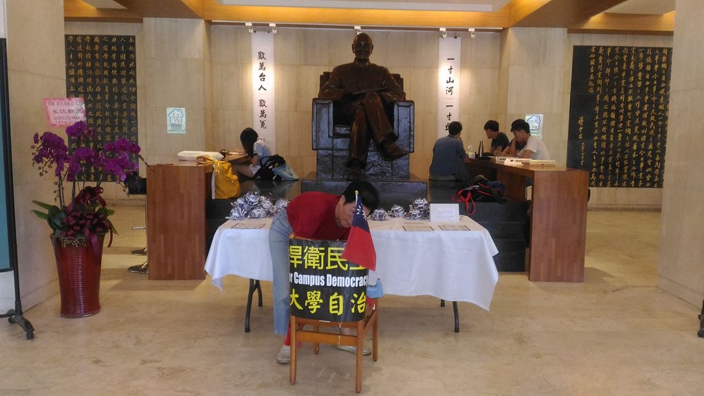 政大野火陣線25日發表聲明表示,當天上午11時,前國大代表,同時也是政大校友的洪秀菊女士,以校友身份進入圖書館大廳,對展品之一的紙蓮花以「強行插上中華民國旗」的方式進行破壞,並用「捍衛民主 大學自治」的手舉牌覆蓋展覽桌,撥亂展品與文字說明。