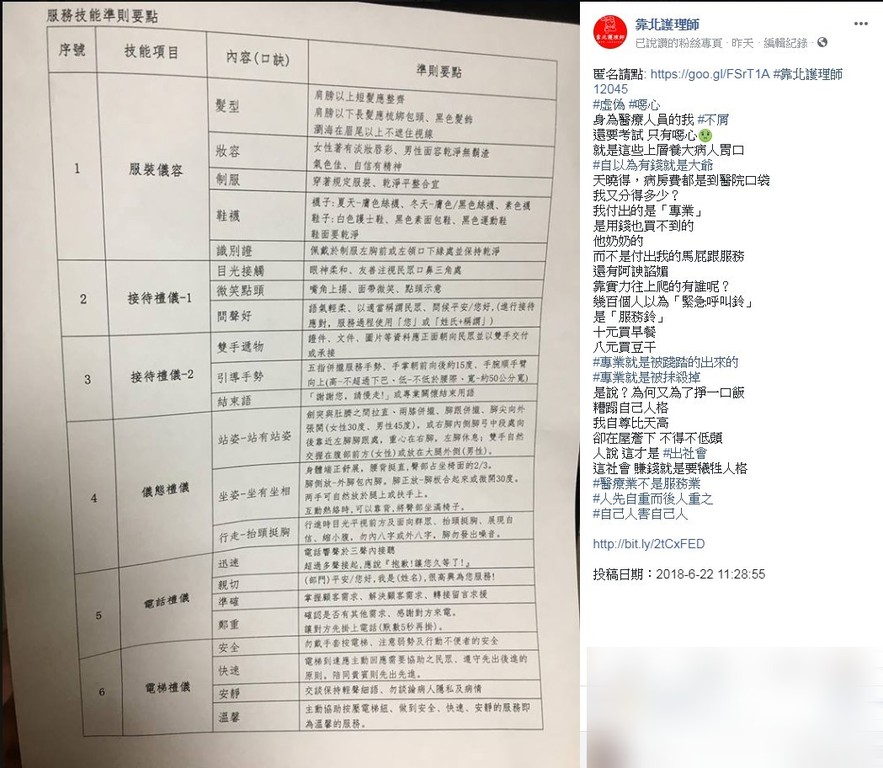 護理師難為!臉書粉絲專頁《靠北護理師》PO出一張護理師的「服務技能準則要點」,讓許多網友都怒了,就連律師呂秋遠也在臉書轉發批「護理師不是禮儀師,真的不需要這麼多繁文縟節。」