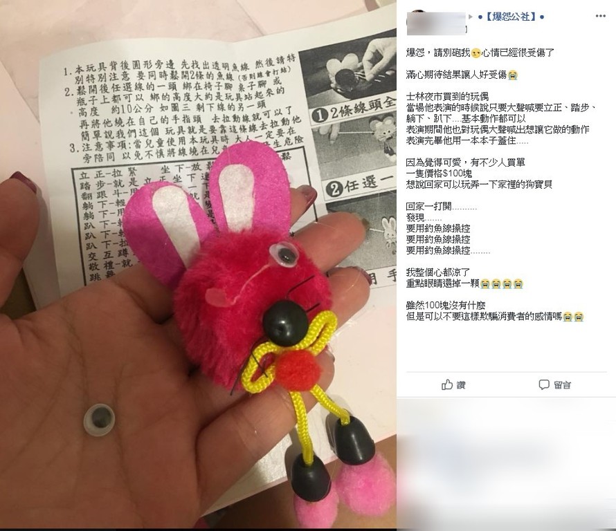 沒想到帶回家後,女網友心涼了,因為這玩偶竟然是用「釣魚線」操控的,而且眼睛還掉了一顆,女網友:「雖然100塊沒有什麼 但是可以不要這樣欺騙消費者的感情嗎」