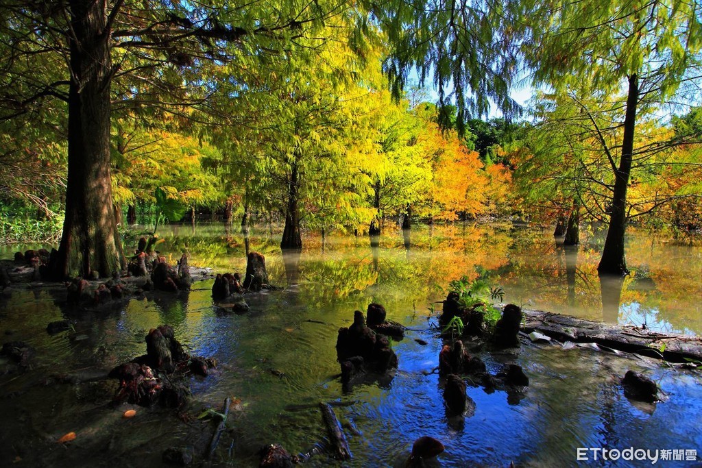 ▲雲山水湛藍的湖水來自中央山脈,水質清澈,倒映兩旁的落羽松,特殊的湖色光景讓它有「夢幻湖」之稱。(圖/縱管處提供)