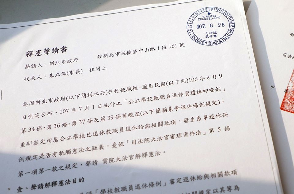 新北市府28日召開記者會,認為年改嚴重損害退休公教人員的權益,已撰具釋憲聲請書,正式向司法院聲請釋憲。