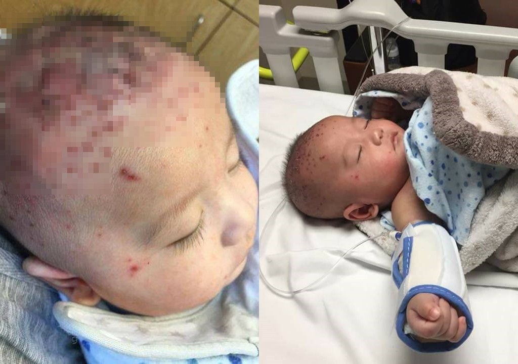 ▲長輩感冒還親一下,害嬰兒感染皰疹住院,頭部長滿紅點又化膿結痂。(圖/翻攝自臉書/下同)