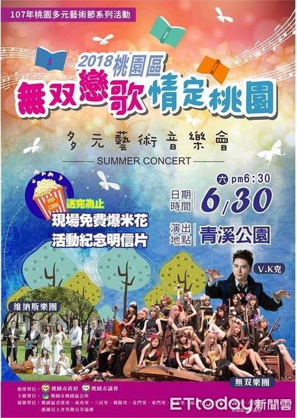 桃園區公所主辦「多元藝術音樂會」30日晚間於青溪公園展開,區長張世威指出,多元藝術音樂會」邀請到以國樂器將歌曲演繹出充滿想像力與故事性的無双樂團、音樂充滿幻想因子曲風充滿魅力的V.K克以及跨足古典與流行爵士的維納斯樂團等3個知名團體,為大家帶來一場音樂與美結合的饗宴。