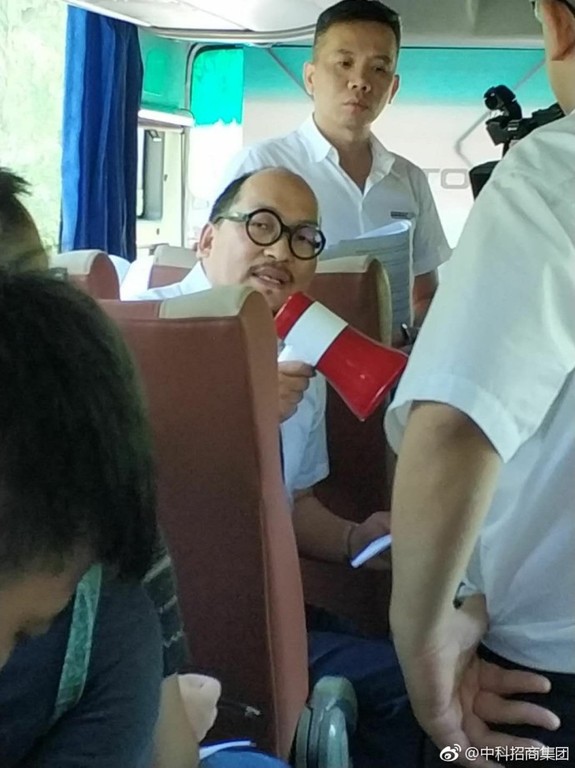▲中科招商解釋,因公安和酒店方接到惡意舉報取消會議室,才會在大巴士上開會。