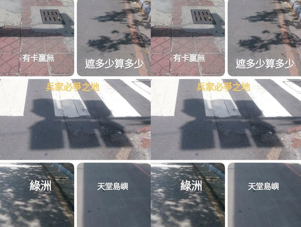 原PO在「爆廢公社」臉書社團貼出陰影面積組圖,只見若是「一根柱子」的陰影面積是「有卡贏無」;些許樹枝、樹葉的陰影是「遮多少算多少」;紅綠燈號誌底下的陰影是「兵家必爭之地」;一大片樹枝、樹葉是「綠洲」;如果是一棟建物的超大片陰影則是「天堂島嶼」。該文獲得超過8000人按讚。