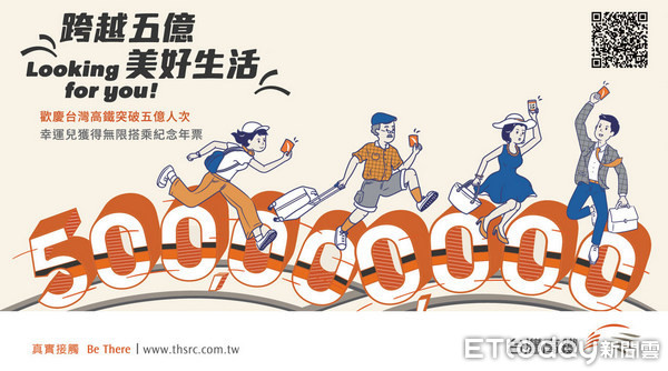 台灣高鐵2018年迄6月底為止,每日平均旅運17萬3千人次,較去年同期成長5%,高鐵公司每日將於活動網站公布「跨越五億 美好生活」每第10萬人次的銷售票號,敬請近期購票的旅客務必保留票根兌獎。