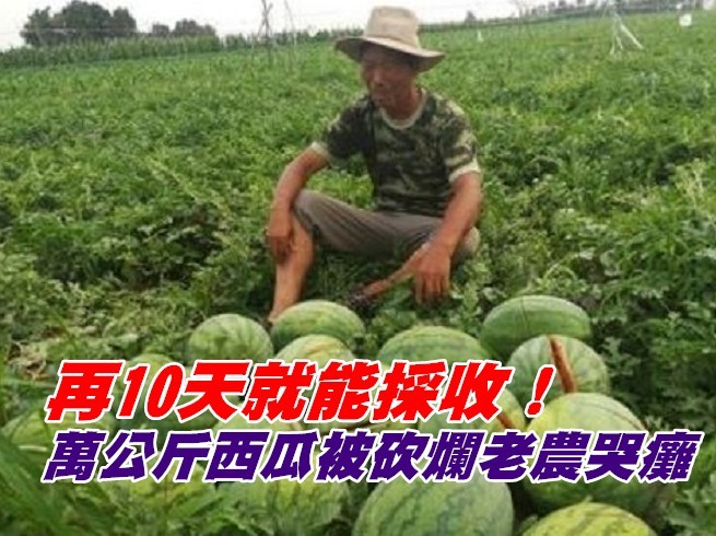 河南省登封市64歲瓜農王彥明忙碌大半年,眼看2畝瓜田共2萬多斤(約1萬公斤)的西瓜再10天就能收成,沒想到一夜之間就全遭人一刀一刀砍爛,全家的收入來源頓時陷入困境,讓他難過地坐在瓜田裡邊哭邊說,「以後不再種瓜了。」