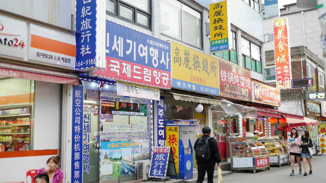 走在首爾的建國大學附近,可以看到許多中文看板。通訊行門口貼著用簡體字寫的「中國學生優惠方案」,左邊賣的則是羊肉串,右邊是一間麵食店,店前的玻璃櫃擺著麻花捲、韭菜盒、蔥油餅等各種中式點心。