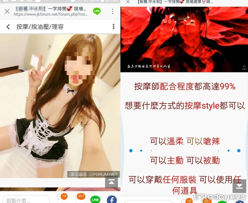 新北市警方日前執行網路巡邏,發現某知名論壇張貼「可以主動、嗆辣、使用任何道具」等性服務資訊,決定化身男客依約到指定民宅,破獲泰國女子組成的三人工作室。警方調查,其中一位A小姐目測身材約80公斤,但敢玩程度令人咋舌,無套、雙飛、多P服務樣樣來,生意超好,2周接客數已經超過百人,員警反諷說「不怕得病就為了賺錢,一堆男客捧場,真的太神啦!」訊後依法送辦。