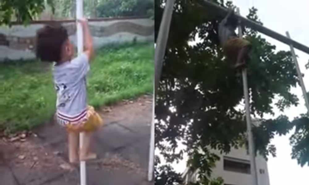 影片中,男孩把鞋子脫掉,趴上竿子後,手腳並用的往上爬。雖然竿子看起來比小孩的手臂還粗,但他雙腳夾緊竿子,雙手一拉就順利爬高,碰到頂端橫竿只花了約25秒的時間。之後小男孩要滑回地面時,還問「跳下來可以嗎」,一點也不畏高。