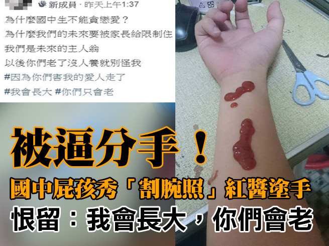 張姓網友4日上午在「爆廢公社」轉貼一張臉書截圖,內容是屁孩疑似在父母長輩壓力下被逼和女友分手,PO留下憤恨字句,還附上一張「割腕照」明志。「為什麼國中生不能貪(談)戀愛?為什麼我們的未來要被家長給限制住?」屁孩語帶無奈,指兒童是國家未來的主人翁,長輩這樣威逼、拆散一對佳人,「以後你們老了沒人養就別怪我」!
