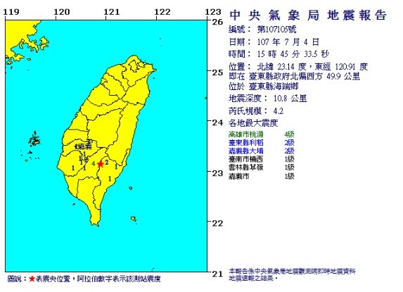 台東又地震!今(4)日下午15時45分發生芮氏規模4.2地震,震央位於台東縣海端鄉,地震深度10.8公里。各地最大震度高雄市桃源4級,台東縣利稻及嘉義縣大埔2級,台南市楠西、雲林縣草嶺、嘉義市各1級。