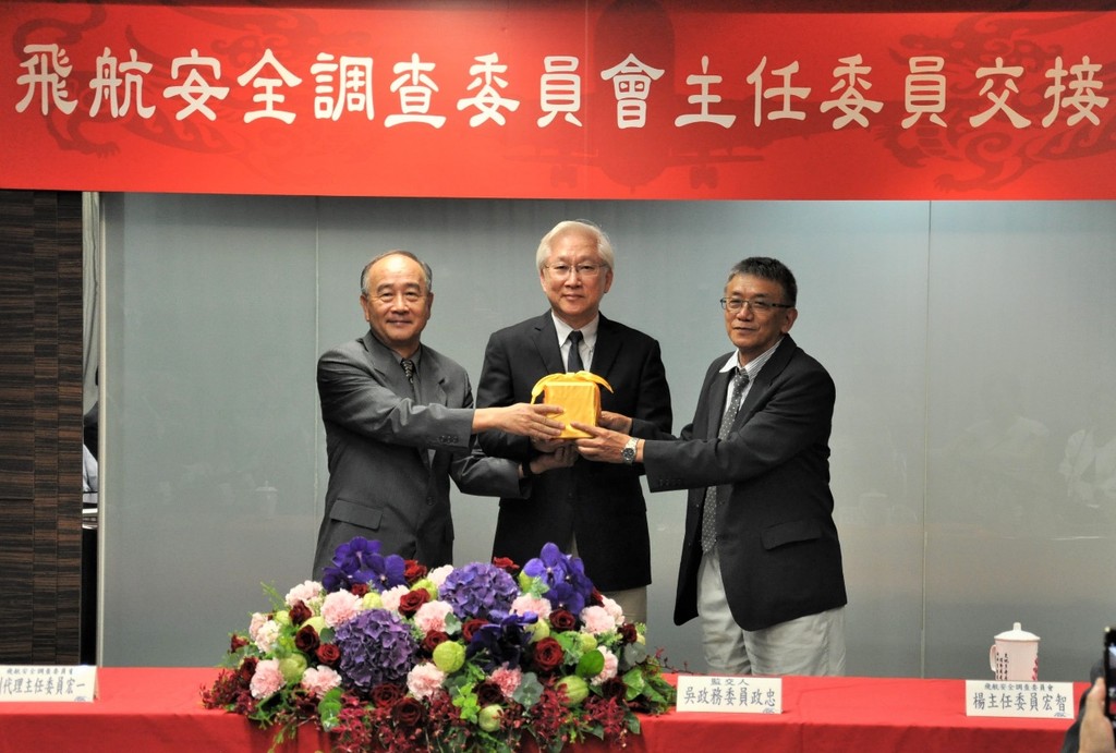 ▲在政務委員黃政忠(中)監交下,飛安會主委一職由暫代委員劉宏一(左)正式交給台大教授楊宏智(右)。(圖/飛安會提供)