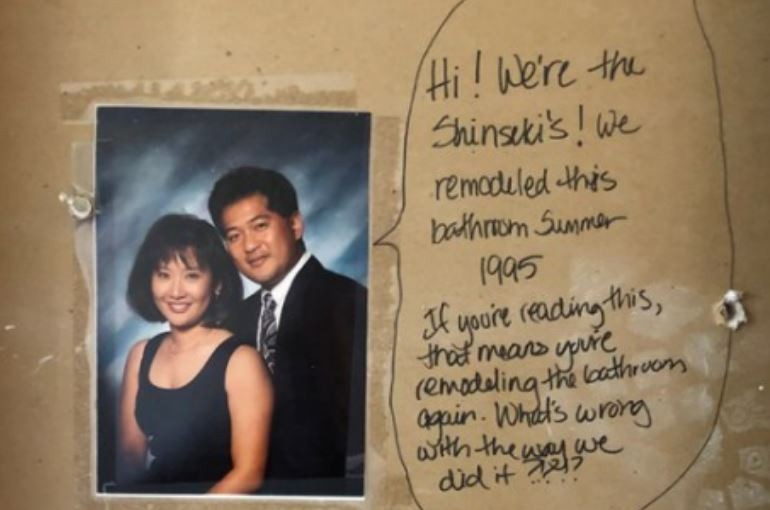 石膏板上貼著一張前屋主夫妻的合照,一旁寫著,「嗨!我們是新關(Shinseki)夫婦。我們在1995年夏天重新裝潢了浴室。當你在讀這段訊息時,表示你們正在重新裝修這間浴室。我們裝潢得哪裡不好?」