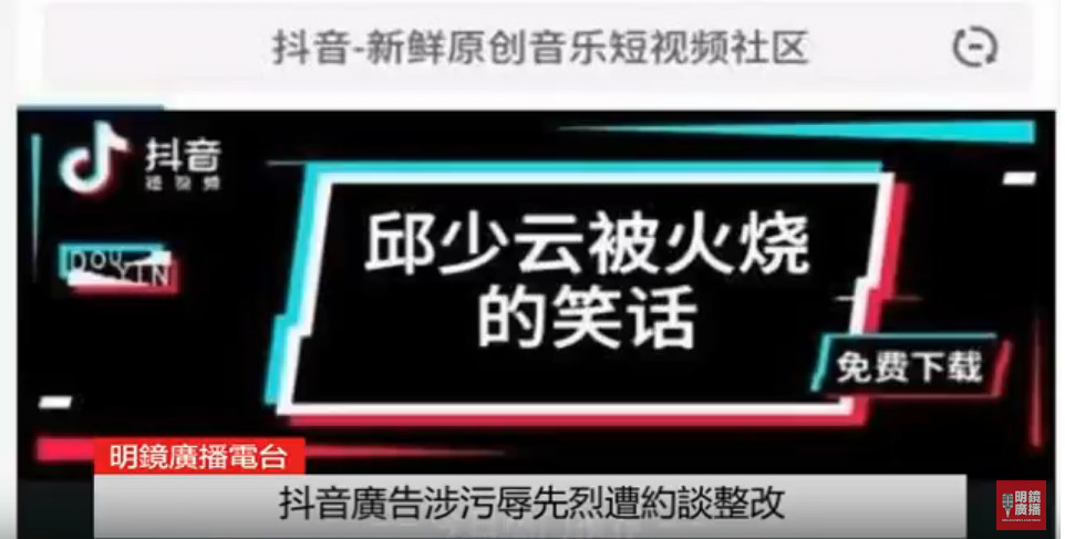 除了印尼,近日抖音也在起源地中國惹上了麻煩。因為抖音在投放廣告中含有調侃中共烈士邱少雲的內容,在廣告欄出現「邱少雲被火燒的笑話免費下載」等字樣。(P.S.:他是在韓戰時被美軍燃燒彈擊中後活活燒死。)